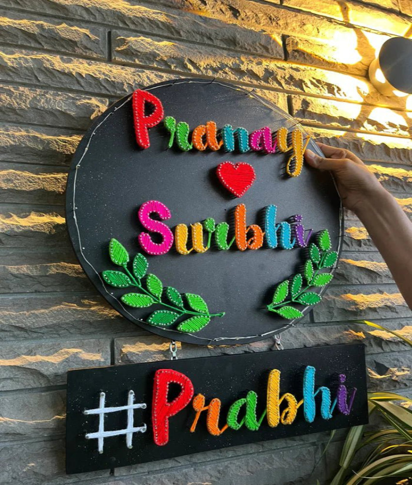 • Custom Hashtag String Art: A smaller rectangular sign features a custom hashtag, like "#Prabhi," crafted in the same vibrant, multi-colored string art style. This modern and playful detail is a fun way to represent your couple's identity.